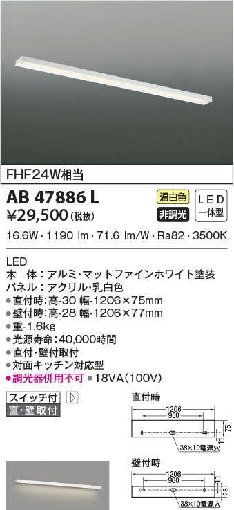 | 補足・注意事項 | ◆消費電力:16.6W ◆色温度:3500K ◆演色性:Ra82 ◆光源寿命:40,000時間 ◆直付・壁付取付 ◆対面キッチン対応型 ◆壁付時:高-28 幅-1206×77mm ◆調光器併用不可 |