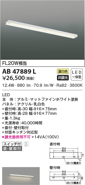| 補足・注意事項 | ◆消費電力:12.4W ◆色温度:3500K ◆演色性:Ra82 ◆光源寿命:40,000時間 ◆直付・壁付取付 ◆対面キッチン対応型 ◆壁付時:高-28 幅-916×77mm ◆調光器併用不可 |