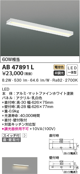 | 補足・注意事項 | ◆消費電力:8.2W ◆色温度:2700K ◆演色性:Ra82 ◆光源寿命:40,000時間 ◆直付・壁付取付 ◆対面キッチン対応型 ◆壁付時:高-28 幅-626×77mm ◆調光器併用不可 |