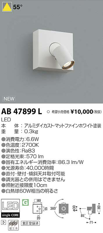 | 補足・注意事項 | ◆消費電力:6.6W ◆色温度:2700K ◆演色性:Ra83 ◆光源寿命:40,000時間 ◆傾斜天井に取付可能(90°まで) ◆調光器との併用はできません ◆照射近接限度10cm |