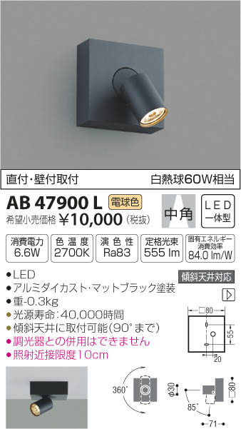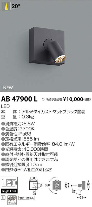 | 補足・注意事項 | ◆消費電力:6.6W ◆色温度:2700K ◆演色性:Ra83 ◆光源寿命:40,000時間 ◆傾斜天井に取付可能(90°まで) ◆調光器との併用はできません ◆照射近接限度10cm |