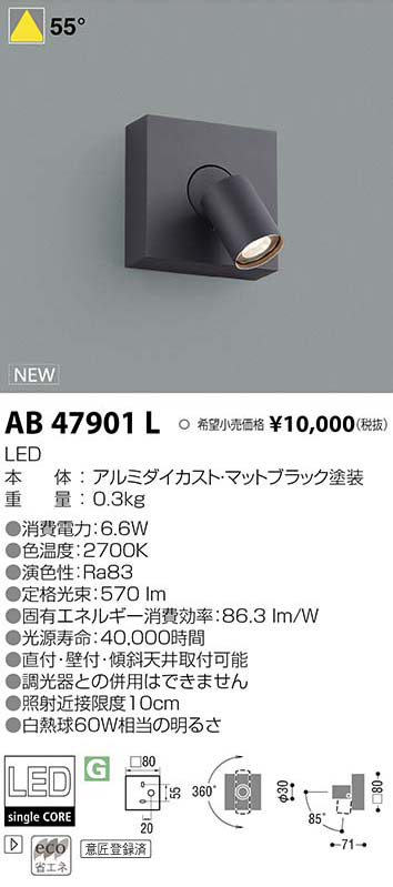 | 補足・注意事項 | ◆消費電力:6.6W ◆色温度:2700K ◆演色性:Ra83 ◆光源寿命:40,000時間 ◆傾斜天井に取付可能(90°まで) ◆調光器との併用はできません ◆照射近接限度10cm |