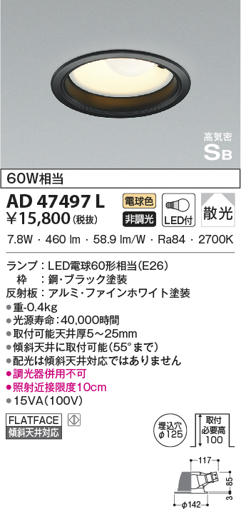 | 補足・注意事項 | ◆消費電力:7.8W ◆色温度:2700K ◆演色性:Ra84 ◆光源寿命:40,000時間 ◆取付可能天井厚5~25mm ◆傾斜天井に取付可能(55°まで) ◆配光は傾斜天井対応ではありません ◆調光器併用不可 ◆照射近接限度10cm |