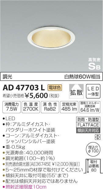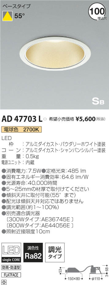 | 補足・注意事項 | ◆消費電力:7.5W ◆色温度:2700K ◆演色性:Ra82 ◆光源寿命:40,000時間 ◆5~25mmの材厚で取付けてください ◆傾斜天井に取付可能(55°まで) ◆配光は傾斜天井対応ではありません ◆調光範囲(約1~100%) ◆別売適合調光器〔300Wタイプ:AE36745E \12,000(税抜)〕〔800Wタイプ:AE44056E \15,800(税抜)〕 ◆照射近接限度10cm |