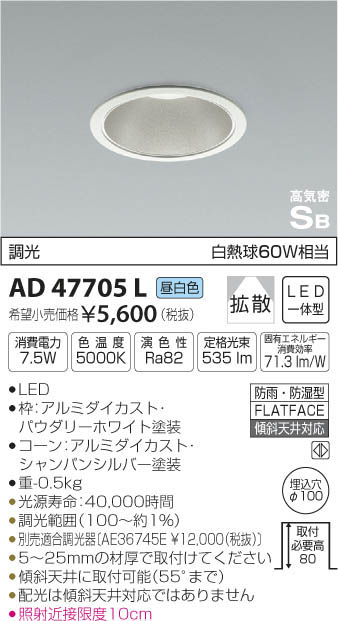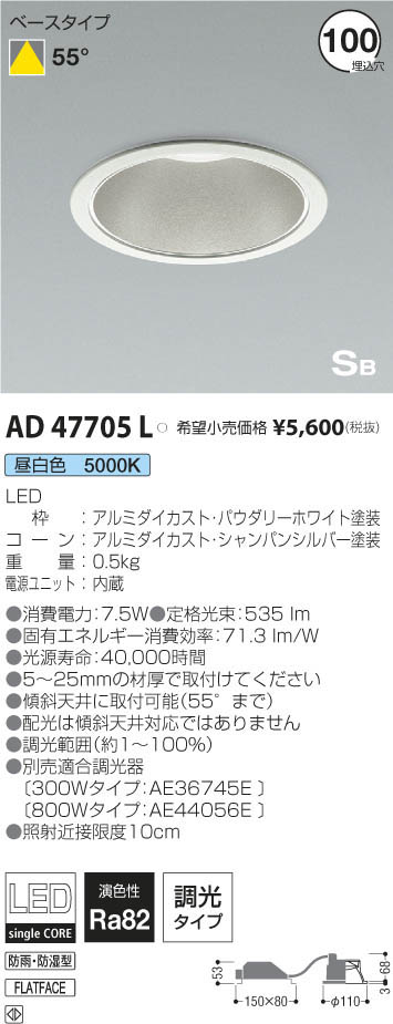 | 補足・注意事項 | ◆消費電力:7.5W ◆色温度:5000K ◆演色性:Ra82 ◆光源寿命:40,000時間 ◆5~25mmの材厚で取付けてください ◆傾斜天井に取付可能(55°まで) ◆配光は傾斜天井対応ではありません ◆調光範囲(約1~100%) ◆別売適合調光器〔300Wタイプ:AE36745E \12,000(税抜)〕〔800Wタイプ:AE44056E \15,800(税抜)〕 ◆照射近接限度10cm |