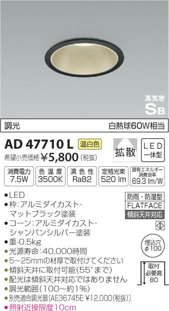 | 補足・注意事項 | ◆消費電力:7.5W ◆色温度:3500K ◆演色性:Ra82 ◆光源寿命:40,000時間 ◆5~25mmの材厚で取付けてください ◆傾斜天井に取付可能(55°まで) ◆配光は傾斜天井対応ではありません ◆調光範囲(100~約1%) ◆別売適合調光器〔AE36745E \12,000(税抜)〕 ◆照射近接限度10cm ※色温度:3500K ※白熱球60W相当 |