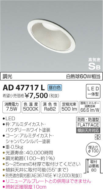 | 補足・注意事項 | ◆消費電力:7.5W ◆色温度:5000K ◆演色性:Ra82 ◆光源寿命:40,000時間 ◆5~25mmの材厚で取付けてください ◆傾斜天井に取付可能(55°まで) ◆調光範囲(100~約1%) ◆別売適合調光器〔AE36745E \12,000(税抜)〕 ◆リニューアルプレートとの併用はできません ◆照射近接限度10cm ※色温度:5000K ※白熱球60W相当 |
