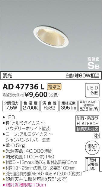 | 補足・注意事項 | ◆消費電力:7.5W ◆色温度:2700K ◆演色性:Ra82 ◆光源寿命:40,000時間 ◆材厚5~13mm未満の時、取付必要高80mm ◆材厚13~25mmの時、取付必要高100mm ◆傾斜天井に取付可能(55°まで) ◆調光範囲(100~約1%) ◆別売適合調光器〔AE36745E \12,000(税抜)〕 ◆照射近接限度10cm ※色温度:2700K ※白熱球60W相当 |
