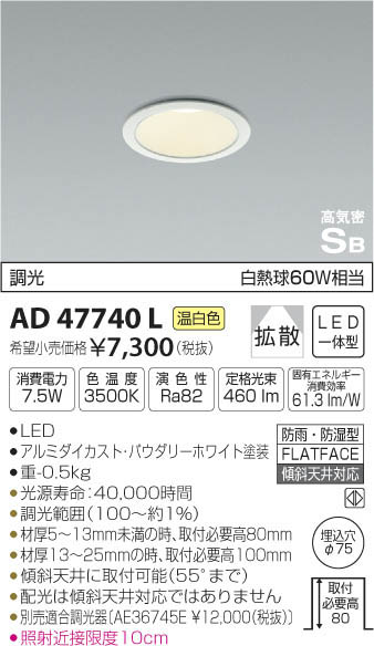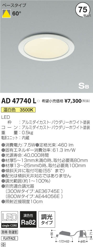 | 補足・注意事項 | ◆消費電力:7.5W ◆色温度:3500K ◆演色性:Ra82 ◆光源寿命:40,000時間 ◆材厚5~13mm未満の時、取付必要高80mm ◆材厚13~25mmの時、取付必要高100mm ◆傾斜天井に取付可能(55°まで) ◆配光は傾斜天井対応ではありません ◆調光範囲(約1~100%) ◆別売適合調光器〔300Wタイプ:AE36745E \12,000(税抜)〕〔800Wタイプ:AE44056E \15,800(税抜)〕 ◆照射近接限度10cm |