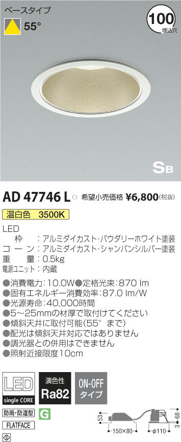 | 補足・注意事項 | ◆消費電力:10.0W ◆色温度:3500K ◆演色性:Ra82 ◆光源寿命:40,000時間 ◆5~25mmの材厚で取付けてください ◆傾斜天井に取付可能(55°まで) ◆配光は傾斜天井対応ではありません ◆調光器との併用はできません ◆照射近接限度10cm |