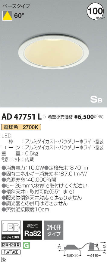 | 補足・注意事項 | ◆消費電力:10.0W ◆色温度:2700K ◆演色性:Ra82 ◆光源寿命:40,000時間 ◆5~25mmの材厚で取付けてください ◆傾斜天井に取付可能(55°まで) ◆配光は傾斜天井対応ではありません ◆調光器との併用はできません ◆照射近接限度10cm |