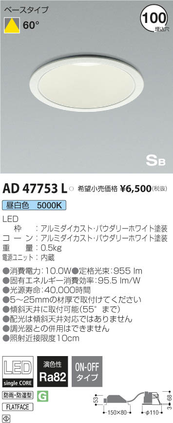| 補足・注意事項 | ◆消費電力:10.0W ◆色温度:5000K ◆演色性:Ra82 ◆光源寿命:40,000時間 ◆5~25mmの材厚で取付けてください ◆傾斜天井に取付可能(55°まで) ◆配光は傾斜天井対応ではありません ◆調光器との併用はできません ◆照射近接限度10cm |
