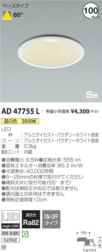 | 補足・注意事項 | ◆消費電力:6.5W ◆色温度:3500K ◆演色性:Ra82 ◆光源寿命:40,000時間 ◆5~25mmの材厚で取付けてください ◆傾斜天井に取付可能(55°まで) ◆配光は傾斜天井対応ではありません ◆調光器との併用はできません ◆照射近接限度10cm |