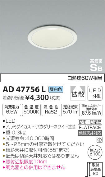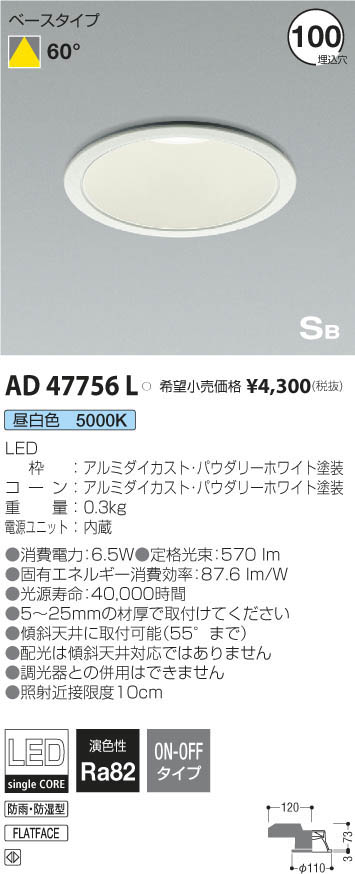 | 補足・注意事項 | ◆消費電力:6.5W ◆色温度:5000K ◆演色性:Ra82 ◆光源寿命:40,000時間 ◆5~25mmの材厚で取付けてください ◆傾斜天井に取付可能(55°まで) ◆配光は傾斜天井対応ではありません ◆調光器との併用はできません ◆照射近接限度10cm |
