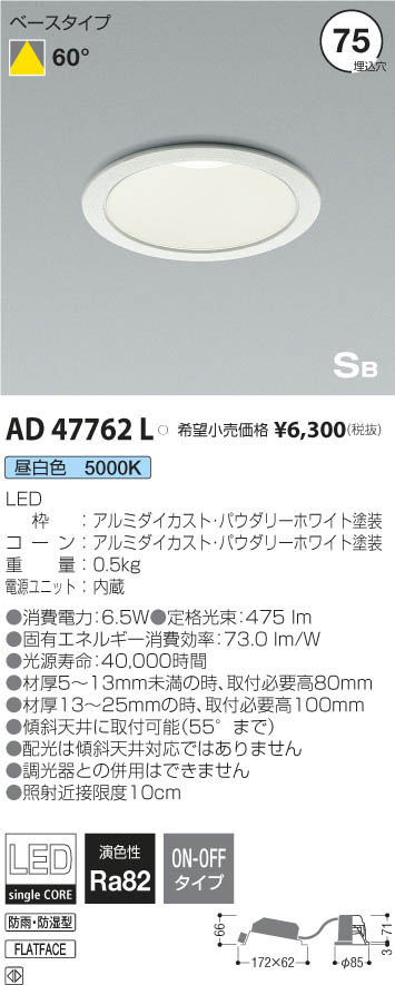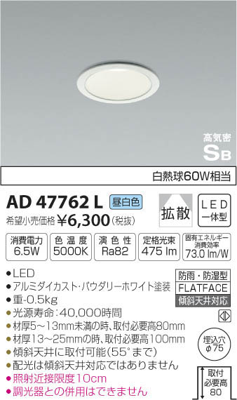 | 補足・注意事項 | ◆消費電力:6.5W ◆色温度:5000K ◆演色性:Ra82 ◆光源寿命:40,000時間 ◆材厚5~13mm未満の時、取付必要高80mm ◆材厚13~25mmの時、取付必要高100mm ◆傾斜天井に取付可能(55°まで) ◆配光は傾斜天井対応ではありません ◆調光器との併用はできません ◆照射近接限度10cm |