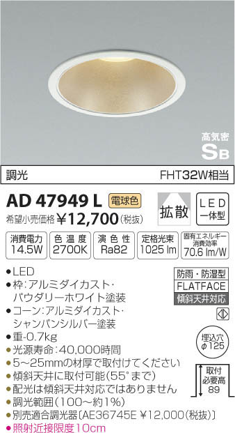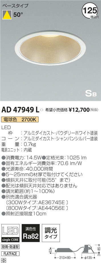 | 補足・注意事項 | ◆消費電力:14.5W ◆色温度:2700K ◆演色性:Ra82 ◆光源寿命:40,000時間 ◆5~25mmの材厚で取付けてください ◆傾斜天井に取付可能(55°まで) ◆配光は傾斜天井対応ではありません ◆調光範囲(約1~100%) ◆別売適合調光器〔300Wタイプ:AE36745E \12,000(税抜)〕〔800Wタイプ:AE44056E \15,800(税抜)〕 ◆照射近接限度10cm |