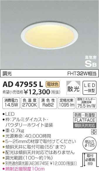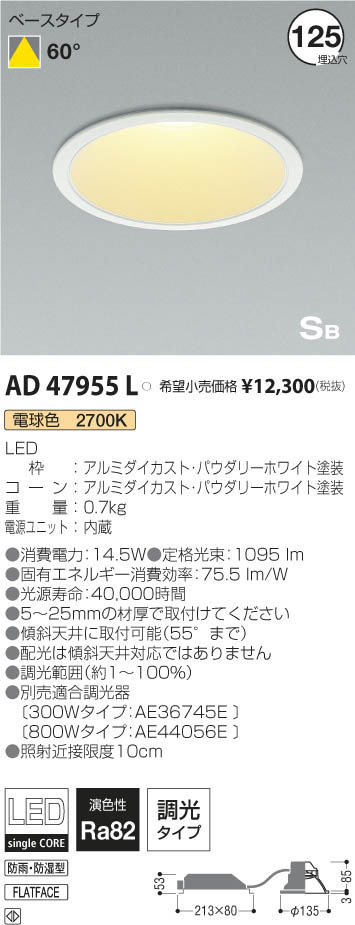 | 補足・注意事項 | ◆消費電力:14.5W ◆色温度:2700K ◆演色性:Ra82 ◆光源寿命:40,000時間 ◆5~25mmの材厚で取付けてください ◆傾斜天井に取付可能(55°まで) ◆配光は傾斜天井対応ではありません ◆調光範囲(約1~100%) ◆別売適合調光器〔300Wタイプ:AE36745E \12,000(税抜)〕〔800Wタイプ:AE44056E \15,800(税抜)〕 ◆照射近接限度10cm |