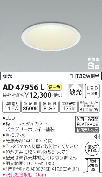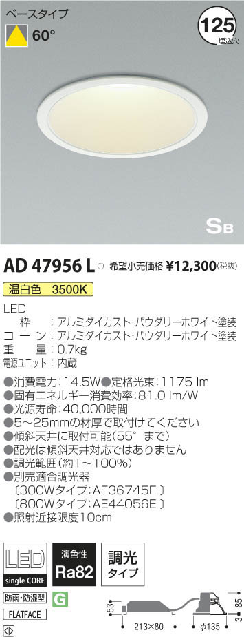 | 補足・注意事項 | ◆消費電力:14.5W ◆色温度:3500K ◆演色性:Ra82 ◆光源寿命:40,000時間 ◆5~25mmの材厚で取付けてください ◆傾斜天井に取付可能(55°まで) ◆配光は傾斜天井対応ではありません ◆調光範囲(約1~100%) ◆別売適合調光器〔300Wタイプ:AE36745E \12,000(税抜)〕〔800Wタイプ:AE44056E \15,800(税抜)〕 ◆照射近接限度10cm |