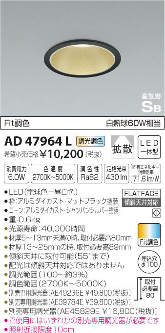 | 補足・注意事項 | ◆消費電力:6W ◆色温度:2700K ◆演色性:Ra82 ◆光源寿命:40,000時間 ◆材厚5~13mm未満の時、取付必要高80mm ◆材厚13~25mmの時、取付必要高89mm ◆傾斜天井に取付可能(55°まで) ◆配光は傾斜天井対応ではありません ◆調光範囲(100~約3%) ◆調色範囲(2700K~5000K) ◆別売専用調光器〔AE49236E \49,800(税抜)〕 ◆別売専用調光器〔AE39784E \39,800(税抜)〕 ◆別売専用調光器〔AE45829E \16,800(税抜)〕 ◆ご使用にはいずれかの別売専用調光器が必要です ◆照射近接限度10cm ※色温度:2700K~5000K ※白熱球60W相当 |