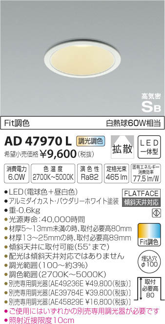 | 補足・注意事項 | ◆消費電力:6W ◆色温度:2700K ◆演色性:Ra82 ◆光源寿命:40,000時間 ◆材厚5~13mm未満の時、取付必要高80mm ◆材厚13~25mmの時、取付必要高89mm ◆傾斜天井に取付可能(55°まで) ◆配光は傾斜天井対応ではありません ◆調光範囲(100~約3%) ◆調色範囲(2700K~5000K) ◆別売専用調光器〔AE49236E \49,800(税抜)〕 ◆別売専用調光器〔AE39784E \39,800(税抜)〕 ◆別売専用調光器〔AE45829E \16,800(税抜)〕 ◆ご使用にはいずれかの別売専用調光器が必要です ◆照射近接限度10cm ※色温度:2700K~5000K ※白熱球60W相当 |