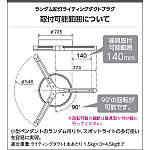 | 補足・注意事項 | ◆適合負荷100V専用600W(6A)まで(ライティングダクト1本あたり200W(2A)まで) ◆適合重量:4.5kgまで(ライティングダクト1本あたり1.5kgまで) ◆取付方向0°・90° ◆ライトコントローラなどの調光器と併用の場合、適合器具以外の照明器具は取付不可 ◆一部の機種で取り付け方向が規制されるものがあります |