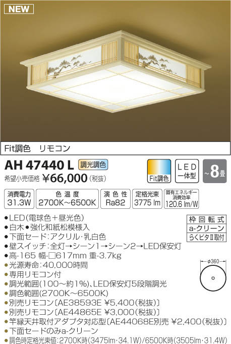 | 補足・注意事項 | ◆消費電力:31.3W ◆色温度:2700K ◆演色性:Ra82 ◆光源寿命:40,000時間 ◆専用リモコン付 ◆調光範囲(100~約1%)、LED保安灯5段階調光 ◆調色範囲(2700K~6500K) ◆別売リモコン〔AE38593E \5,400(税抜)〕 ◆別売リモコン〔AE44865E \3,000(税抜)〕 ◆竿縁天井取付アダプタ対応型〔AE44068E別売 \2,400(税抜)〕 ◆内セードのみa-クリーン ◆調色時定格光束値:2700K時(3475lm・34.1W)/6500K時(3505lm・31.4W) ※色温度:2700K~6500K |