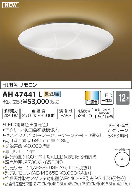 | 補足・注意事項 | ◆消費電力:42.1W ◆色温度:2700K ◆演色性:Ra82 ◆光源寿命:40,000時間 ◆専用リモコン付 ◆調光範囲(100~約1%)、LED保安灯5段階調光 ◆調色範囲(2700K~6500K) ◆別売リモコン〔AE38593E \5,400(税抜)〕 ◆別売リモコン〔AE44865E \3,000(税抜)〕 ◆竿縁天井取付アダプタ対応型〔AE44068E別売 \2,400(税抜)〕 ◆虫などの入りにくい構造 ◆調色時定格光束値:2700K時(4895lm・45.9W)/6500K時(4965lm・42.1W) ※色温度:2700K~6500K |