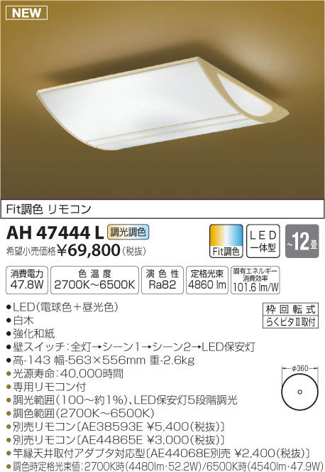 | 補足・注意事項 | ◆消費電力:47.8W ◆色温度:2700K ◆演色性:Ra82 ◆光源寿命:40,000時間 ◆専用リモコン付 ◆調光範囲(100~約1%)、LED保安灯5段階調光 ◆調色範囲(2700K~6500K) ◆別売リモコン〔AE38593E \5,400(税抜)〕 ◆別売リモコン〔AE44865E \3,000(税抜)〕 ◆竿縁天井取付アダプタ対応型〔AE44068E別売 \2,400(税抜)〕 ◆調色時定格光束値:2700K時(4480lm・52W)/6500K時(4540lm・47.9W) ※色温度:2700K~6500K |