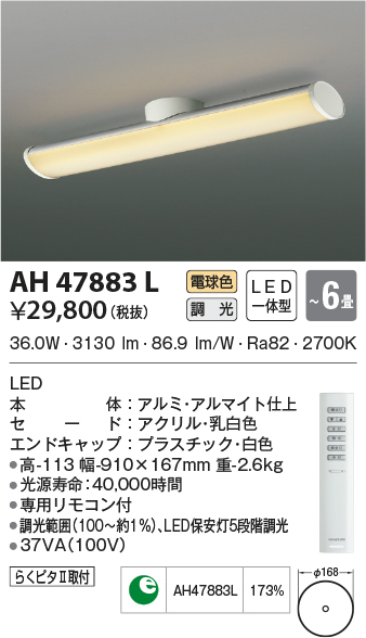 | 補足・注意事項 | ◆消費電力:36.0W ◆色温度:2700K ◆演色性:Ra82 ◆光源寿命:40,000時間 ◆専用リモコン付 ◆調光範囲(100~約1%)、LED保安灯5段階調光 |