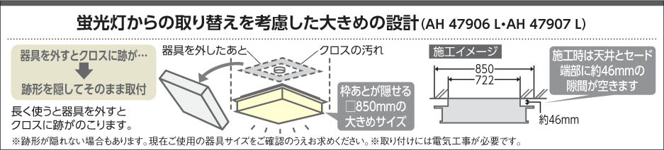 | 補足・注意事項 | ◆消費電力:66.0W ◆光束値:5285lm ◆67VA(100V) ◆色温度:5000K ◆演色性:Ra82 ◆光源寿命:40,000時間 ◆専用リモコン付 |