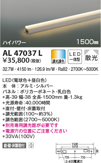 | 補足・注意事項 | ◆消費電力:32.7W ◆色温度:2700K~5000K ◆演色性:Ra82 ◆光源寿命:40,000時間 ◆直付・壁付・床置取付 ◆調光範囲(100~約3%) ◆調色範囲(2700~5000K) ◆別売専用調光器が必要です ※電源穴の位置にご注意ください |