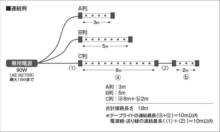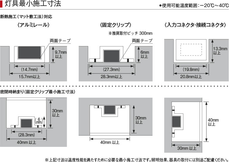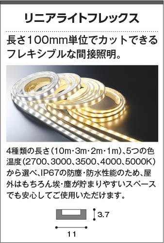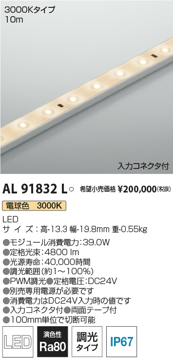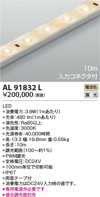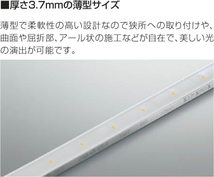 | 補足・注意事項 | ◆消費電力:39.0W ◆光束値:4800lm ◆色温度:3000K ◆演色性:Ra80 ◆光源寿命:40,000時間 ◆調光範囲(100~約1%) ◆消費電力:3.9W(1mあたり) ◆光束:480 lm(1mあたり) ◆演色性:Ra80以上 ◆100mm単位で切断可能 ◆定格電圧:DC24V ◆消費電力はDC24V入力時の値です ◆IP67 ◆両面テープ付 ◆適合調光器別売 ◆別売専用電源が必要です |