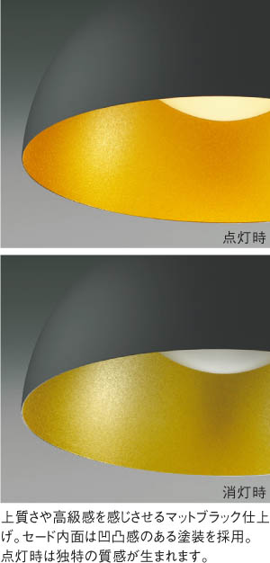 | 部位・材質・色・仕上げ | セード外面:アルミ・マットブラック塗装 セード内面:アルミ・金色塗装サテン 下面カバー:アクリル・乳白色 |