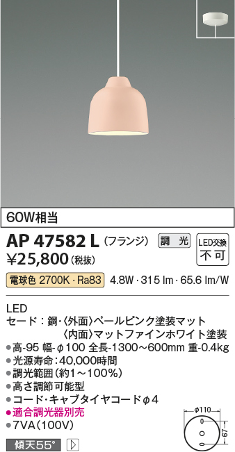 | 補足・注意事項 | ◆消費電力:4.8W ◆光束値:315lm ◆7VA(100V) ◆色温度:2700K ◆演色性:Ra83 ◆光源寿命:40,000時間 ◆調光範囲約1~100% ◆高さ調節可能型 ◆コード・キャブタイヤコードφ4 ◆適合調光器別売 |