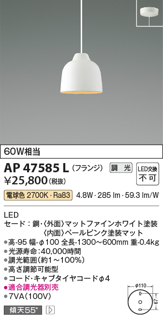 | 補足・注意事項 | ◆消費電力:4.8W ◆光束値:285lm ◆7VA(100V) ◆色温度:2700K ◆演色性:Ra83 ◆光源寿命:40,000時間 ◆調光範囲約1~100% ◆高さ調節可能型 ◆コード・キャブタイヤコードφ4 ◆適合調光器別売 |