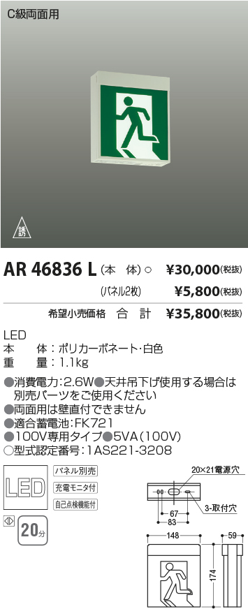 | 補足・注意事項 | ◆消費電力:2.6W ◆5VA(100V) ◆蓄電池容量20分 ◆適合蓄電池:FK721 ◆型式認定番号:1AS221-3208 ◆天井吊下げ使用する場合は別売パーツをご使用ください ◆両面用は壁直付できません ※100V専用 |