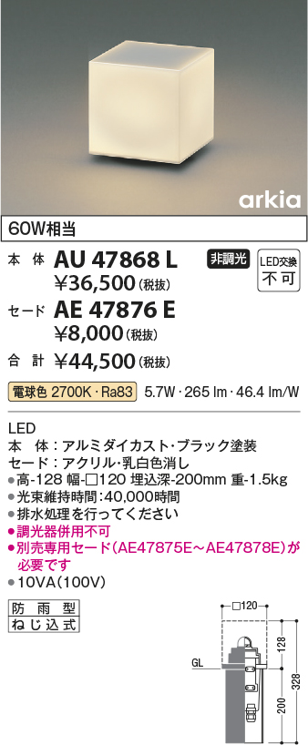 | 補足・注意事項 | ◆消費電力:5.7W ◆光束値:320lm ◆10VA(100V) ◆色温度:2700K ◆演色性:Ra83 ◆光束維持時間:40,000時間 ◆排水処理を行ってください ◆調光器併用不可 ◆別売専用セード(AE47875E~AE47878E)が必要です |