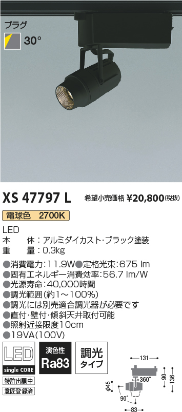 補足・注意事項 | ◆消費電力:11.9W ◆光束値:675lm ◆19VA(100V) ◆色温度:2700K ◆演色性:Ra83 ◆光源寿命:40,000時間 ◆調光範囲(約1~100%) ◆調光には別売適合調光器が必要です ◆直付・壁付・傾斜天井取付可能 ◆照射近接限度10cm |