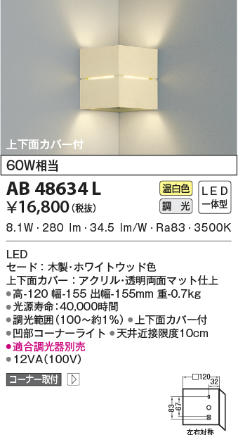 | 補足・注意事項 | ◆消費電力:8.1W ◆色温度:3500K ◆演色性:Ra83 ◆光源寿命:40,000時間 ◆調光範囲(100~約1%) ◆上下面カバー付 ◆凹部コーナーライト ◆適合調光器別売 ◆天井近接限度10cm |