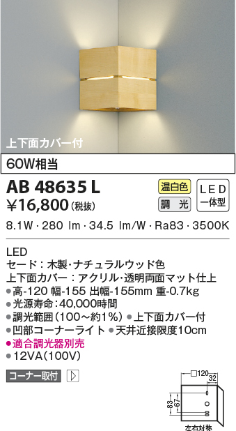| 補足・注意事項 | ◆消費電力:8.1W ◆色温度:3500K ◆演色性:Ra83 ◆光源寿命:40,000時間 ◆調光範囲(100~約1%) ◆上下面カバー付 ◆凹部コーナーライト ◆適合調光器別売 ◆天井近接限度10cm |