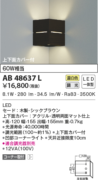 | 補足・注意事項 | ◆消費電力:8.1W ◆光束値:280lm ◆12VA(100V) ◆色温度:3500K ◆演色性:Ra83 ◆光源寿命:40,000時間 ◆調光範囲(100~約1%) ◆上下面カバー付 ◆凹部コーナーライト ◆適合調光器別売 ◆天井近接限度10cm |