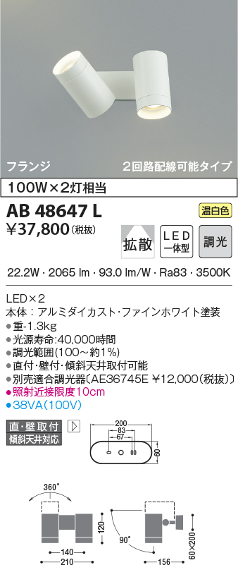 | 補足・注意事項 | ◆消費電力:22.2W ◆光束値:2065lm ◆38VA(100V) ◆色温度:3500K ◆演色性:Ra83 ◆光源寿命:40,000時間 ◆調光範囲(100~約1%) ◆直付・壁付・傾斜天井取付可能 ◆別売適合調光器〔AE36745E \12,000(税抜)〕 ◆照射近接限度10cm |