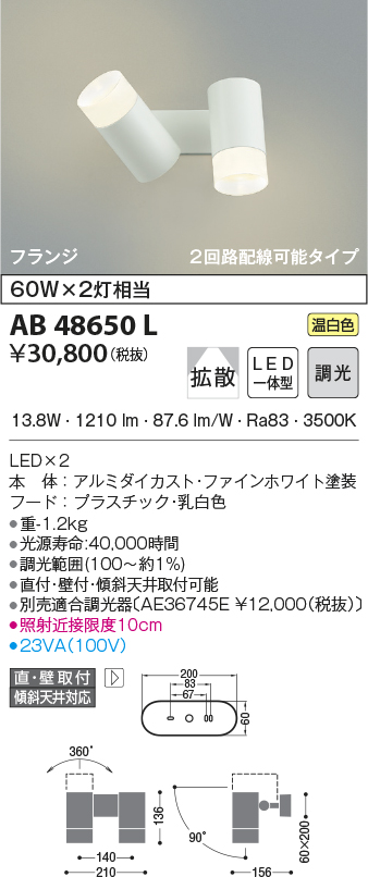 | 補足・注意事項 | ◆消費電力:13.8W ◆光束値:1210lm ◆23VA(100V) ◆色温度:3500K ◆演色性:Ra83 ◆光源寿命:40,000時間 ◆調光範囲(100~約1%) ◆直付・壁付・傾斜天井取付可能 ◆別売適合調光器〔AE36745E \12,000(税抜)〕 ◆照射近接限度10cm |