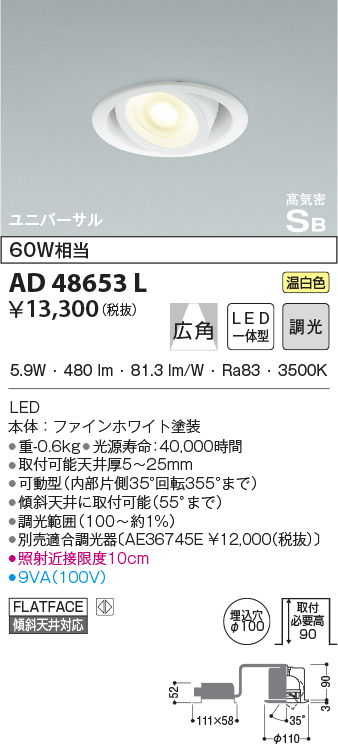 | 補足・注意事項 | ◆消費電力:5.9W ◆色温度:3500K ◆演色性:Ra83 ◆光源寿命:40,000時間 ◆調光範囲(100~約1%) ◆取付可能天井厚5~25mm ◆可動型(内部片側35°回転355°まで) ◆傾斜天井に取付可能(55°まで) ◆別売適合調光器〔AE36745E \12,000(税抜)〕 ◆照射近接限度10cm |