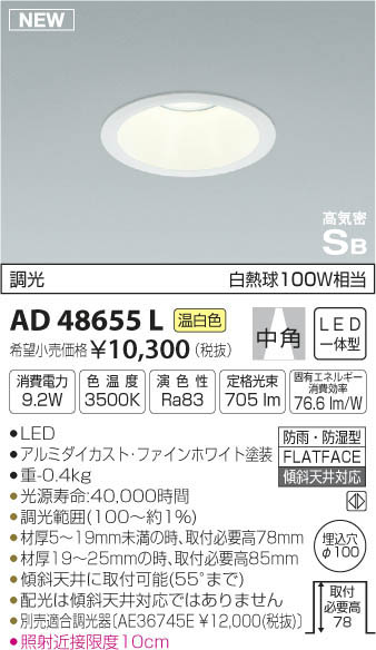 | 補足・注意事項 | ◆消費電力:9.2W ◆色温度:3500K ◆演色性:Ra83 ◆光源寿命:40,000時間 ◆調光範囲(100~約1%) ◆材厚5~19mm未満の時、取付必要高78mm ◆材厚19~25mmの時、取付必要高85mm ◆傾斜天井に取付可能(55°まで) ◆配光は傾斜天井対応ではありません ◆別売適合調光器〔AE36745E \12,000(税抜)〕 ◆照射近接限度10cm ※色温度:3500K ※白熱球100W相当 |