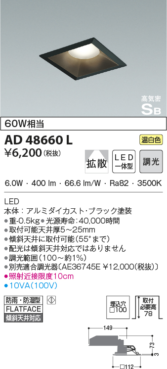 | 補足・注意事項 | ◆消費電力:6.0W ◆光束値:400lm ◆10VA(100V) ◆色温度:3500K ◆演色性:Ra82 ◆光源寿命:40,000時間 ◆調光範囲(100~約1%) ◆取付可能天井厚5~25mm ◆傾斜天井に取付可能(55°まで) ◆配光は傾斜天井対応ではありません ◆別売適合調光器〔AE36745E \12,000(税抜)〕 ◆照射近接限度10cm |