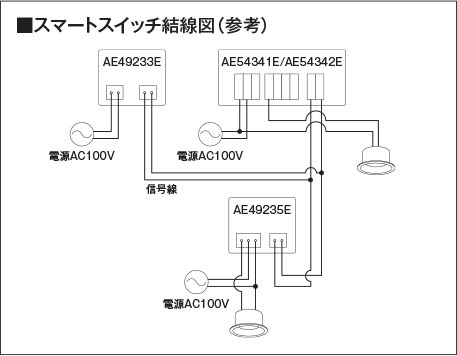 | 補足・注意事項 | ◆1個用スイッチボックス(カバー付)JISC8340/JISC8435取付専用 ◆AC100V ◆信号線φ0.9~φ1.2CPEV ◆別売スマートアダプタ対応(AE49233E) ◆2A(200VA)まで ※3線式/4線式 |