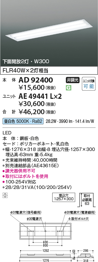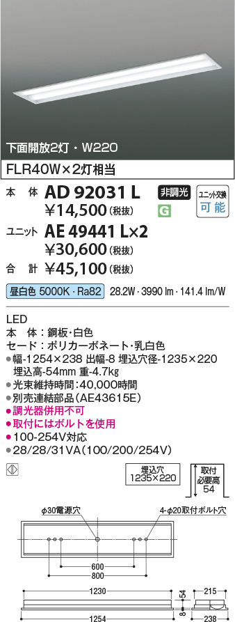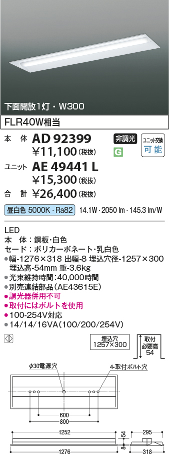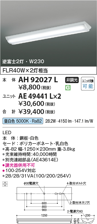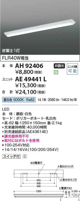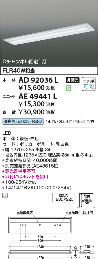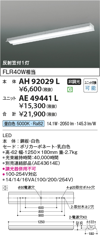 | 補足・注意事項 | ◆消費電力:14.1W ◆14/14/16VA(100/200/254V) ◆色温度:5000K ◆演色性:Ra82 ◆光束維持時間:40,000時間 ◆調光器併用不可 |