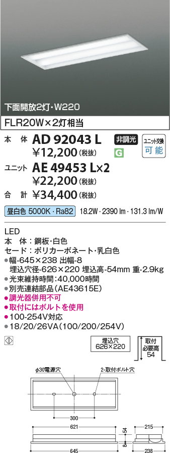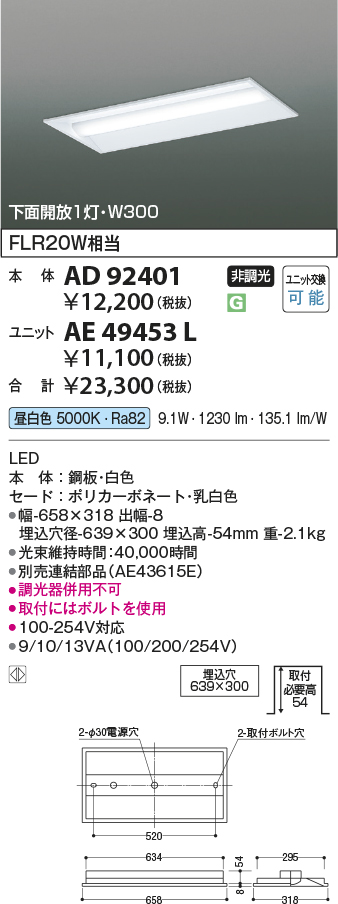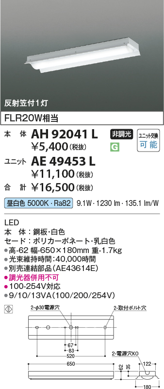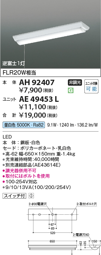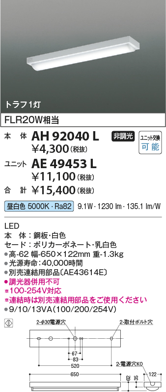 | 補足・注意事項 | ◆消費電力:9.1W ◆9/10/13VA(100/200/254V) ◆色温度:5000K ◆演色性:Ra82 ◆光束維持時間:40,000時間 ◆調光器併用不可 |