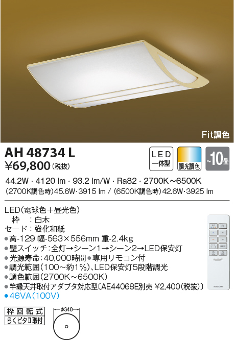 | 補足・注意事項 | ◆消費電力:44.2W ◆光束値:4120lm ◆46VA(100V) ◆色温度:2700K~6500K ◆演色性:Ra82 ◆光源寿命:40,000時間 ◆専用リモコン付 ◆調光範囲(100~約1%)、LED保安灯5段階調光 ◆調色範囲(2700K~6500K) ◆竿縁天井取付アダプタ対応型〔AE44068E別売 \2,400(税抜)〕 ◆(2700K調色時)45.6W・3915 lm/(6500K調色時)42.6W・3925 lm ※上記の数値は、2700K時の値です |